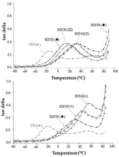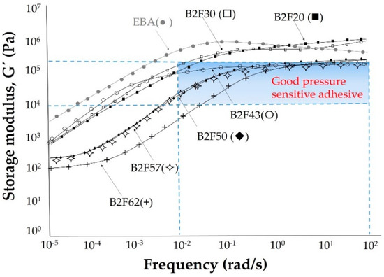 The viscoelastic properties of the EBA copolymer + ECH resin blends were determined by frequency sweep plate–plate rheology experiment and the variation of the storage modulus (G′) as a function of the frequency is shown in Figure 9. At high frequency, in the glassy region, the storage modulus decreases in the binary blends containing 43 wt% or more ECH resin, likely due to the decrease in the crystallinity of the EBA copolymer. When the glass transition is produced, the storage moduli of the blends decrease with decreasing frequency. For the binary blends both the storage modulus and the frequency at which the glass transition starts decrease when increasing their ECH resin content, this indicates the miscibility between the EBA copolymer and the ECH resin. On the other hand, the viscoelastic curves of the B2F20 and B2F30 blends are very similar but the one for B2F43 shows lower storage modulus at high frequency, the beginning of the glass transition is displaced to high temperature and the storage modulus is higher at low frequencies. Therefore, the viscoelastic properties of the B2F43 blend are somewhat “anomalous”. The lowest storage moduli correspond to the binary blends containing 50 wt% or more ECH resin.