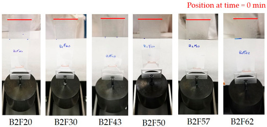 The pressure sensitive adhesives must show a good balance between cohesion and adhesion. The cohesion of the EBA copolymer + ECH resin blends was estimated from the holding time in creep experiments under shear. Figure 11 shows the aspect of the different binary blends applied on PET film after three days of being placed in the equipment for measuring creep. All binary blends show the same creep resistance and none of them fall after three days nor slide from the polished stainless steel plate. Therefore, all binary blends show excellent cohesion.