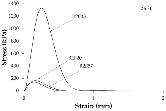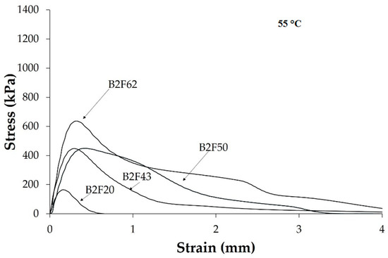 The tack of the EBA copolymer + ECH resin blends was determined using the probe tack method. In this method, the stress–strain curves are obtained and the maximum of the curve is taken as the tack of the binary blend. In a previous study [29] it has been proposed that the shapes of the stress–strain curves of the pressure sensitive adhesives can be related to their viscoelastic response. Thus, the viscoelastic response of a solid pressure sensitive adhesive (i.e., the viscoelastic elastic regime is dominant) corresponds to a stress–strain curve having maximum stress at low strain values, thus the area under the curve is small, whereas the viscoelastic response of a liquid pressure sensitive adhesive (i.e., the viscous viscoelastic regime is dominant) corresponds to a stress–strain curve having maximum stress at medium–high strain values, thus the area under the curve is large. The stress–strain curves at 25 °C of the EBA copolymer + ECH resin blends are given in Figure 12. The stress–strain curves at 25 °C of all binary blends exhibit a maximum at moderate strain, indicating that they have solid pressure sensitive adhesive behavior and, consequently, an interfacial failure between the probe and the surface of the blend is produced during the tests, i.e., the formation of fibrils is not important.
