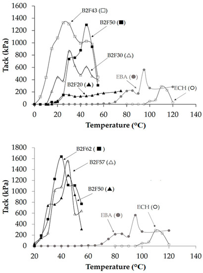 The tack of the EBA copolymer + ECH resin blends was measured at different temperatures and the variation of the tack as a function of the temperature is given in Figure 13. Whereas the ECH resin exhibits low tack above 100 °C and the EBA copolymer shows reasonable tack at about 70 °C, all binary blends are tacky at temperatures lower than 60 °C and the tack is higher than for the individual components of the blends (B2F20 is an exception) because of good compatibility. In fact, it has been shown that the better compatibility between EVA copolymer and resin produced an improvement of the adhesion properties of the EVA copolymer + resin blends [30]. The increase of the ECH resin content up to 43 wt% displaces the maximum of the tack of the binary blend to lower temperature, and the addition of more than 43 wt% ECH resin shifts the maximum of the tack to higher temperature (Figure 13, Table 5); this trend agrees well with the two compatibility behaviors in the binary blends shown above. On the other hand, Table 5 shows that the tack of the binary blends increases by increasing their ECH resin content, and the range of temperatures with tack is, in general, between 20 and 55 °C. Therefore, the compatibility determines the tack of the binary blends but it is also influenced by their degree of crystallinity and their viscoelastic properties.