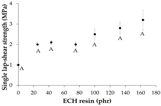 Variation of the single lap-shear strength of aluminum/EBA copolymer + ECH resin blend/aluminum joints as a function of the amount of ECH in the binary blend. Locus of failure: A: Adhesive failure.