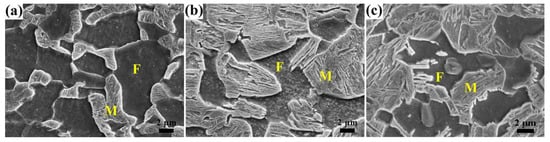 SEM microstructure of high-strength low-alloy (HSLA) steel quenched from (a) 790 °C, (b) 810 °C, (c) 830 °C, (d) 850 °C, and (e) 900 °C, and tempered at 180 °C. (F = ferrite and M = martensite).
