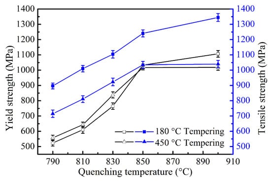 Yield strength and tensile strength as a function of quenching temperature tempered at 180 °C and 450 °C, respectively.