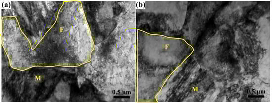 However, the influence of tempering temperature on yield strength and tensile strength is obviously different. The yield strength of the specimens tempered at 450 °C is higher than that tempered at 180 °C when the quenching temperature is below 850 °C, but lower when quenched from 900 °C. This is because when the ferrite fraction is high (>26 vol%), the applied stress is transferred to ferrite grains through the hard martensite and the deformation of ferrite determines the yield strength of the DP steel for its low strength [21]. Meanwhile, the initial martensite transformation introduced many movable dislocations in the adjacent ferrite and its amount is still high even after tempering at 180 °C (see the TEM microstructure in Figure 4a), which makes the ferrite yield under a relatively lower applied stress [22]. The continuous yielding behavior of the specimens in Figure 5a also indicates a large amount of movable dislocations in the microstructures. After tempering at 450 °C, dislocations are pinned by precipitates or slip to tangle with each other as packages locating in the ferrite matrix or near grain boundaries (see Figure 4b), which reduces the amount of movable dislocation resulting in the discontinuous yielding of the stress–strain curves in Figure 5b. So, the onset of plastic deformation of ferrite is successfully suppressed [23,24], and requires a relatively higher applied stress to yield the specimens. Moreover, it is noted that the specimen quenched from 790 °C also shows discontinuous yielding. This is because the initial movable dislocations in ferrite introduced by martensite expansion is low and, after tempering at 180 °C, the dislocations reduce to a lower level which is not enough for the specimen to yield continuously [25]; Marder [26] also pointed out that it needs a minimum amount of martensite transformation to induce enough movable dislocations for the quenched steels to achieve continuous yielding. However, it is still easier for the dislocations to multiply in the 180 °C tempered ferrite than that in the 450 °C tempered ferrite by comparing the yield platforms of the two stress–strain curves quenched from 790 °C. However, the yield strength tempered at 450 °C is lower than that tempered at 180 °C when the ferrite is in low content (3 vol%) and constrained by the interconnected martensite, where the martensite is the main constituent to bear deformation. Even though, in this condition the martensite matrix tempered at 180 °C can yield continuously with enough movable dislocations [27]; it is significantly softened after tempering at 450 °C due to the release of inner stress and matrix decomposition [12,28], so the 450 °C tempered specimens are easier to yield under loading. This is the same condition for the specimens quenched from 900 °C. For the tensile strength, which is determined by the strength of martensite in DP steel, it is lower for the specimens tempered at 450 °C than those tempered at 180 °C in all quenching conditions (see Figure 3). Through the comparison of the specimens quenched from 850 °C and 900 °C, it can be concluded that a small amount of ferrite (3 vol%) almost has no effect on the yield and tensile strength when tempering at high temperature (450 °C), but its influence is significant when the tempering temperature is low (180 °C).