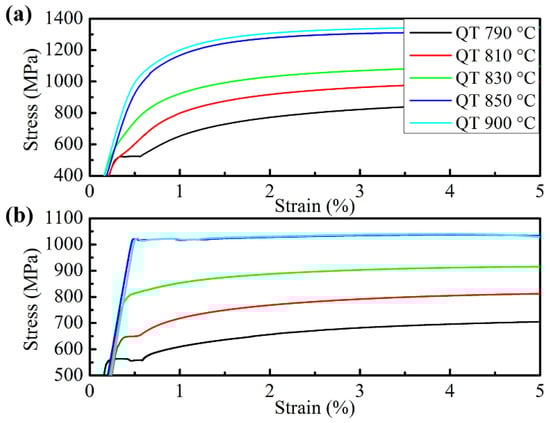Yielding stage of stress–strain curves of specimens quenched from different temperatures and tempered at (a) 180 °C and (b) 450 °C, respectively (QT = quenching temperature).