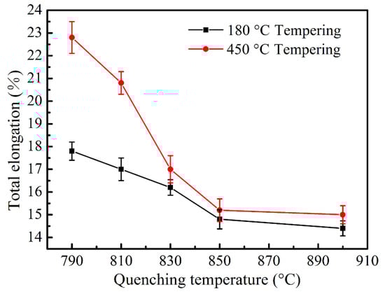Total elongation as a function of quenching temperature tempered at 180 °C and 450 °C, respectively.