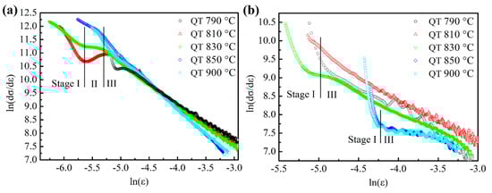 where is the true stress, is the true strain, n is the strain hardening exponent, and and k are material constants. The results of the DC–J analysis of tensile dates are shown in Figure 8. The values of n − 1 at different stages calculated by fitting the slopes of curves for all of the specimens are summarized in Table 3. After tempering at 180 °C, the results of the strain hardening for specimens quenched from 790 °C, 810 °C, and 830 °C show three stages (labeled as stage I, II, and III) according to the values of n − 1 (see Figure 8a), which reveals different deformation mechanisms [25,31,32]. The first stage I is attributed to the homogeneous deformation of the soft ferrite matrix induced by the glide of mobile dislocations or residual stresses surrounding the martensite regions. The second stage II is attributed to the deformation of the constrained ferrite and possible transformation of retained austenite into martensite. Stage III is attributed to the simultaneous deformation of ferrite and martensite. When quenching from 850 °C, the plots of strain hardening show two stages (II and III), which indicates that the ferrite in the microstructure is constrained by martensite and is hard to deform (see Figure 7c). When the quenching temperature increases to 900 °C, only stage III is evident, as expected, due to the deformation of single-phase martensite. These changes are similar to those results of DP steels without tempering in the literature [25,31]. In Table 3, the values of n − 1 in stage I increase with the quenching temperature increasing from 790 °C to 830 °C due to the increasing movable dislocation density in the ferrite matrix along the ferrite–martensite interfaces introduced by the expansion of martensite transformation. However, in the third stage, the values of n − 1 decrease with the increase of martensite volume fraction and this result agrees with other researches [22,32].