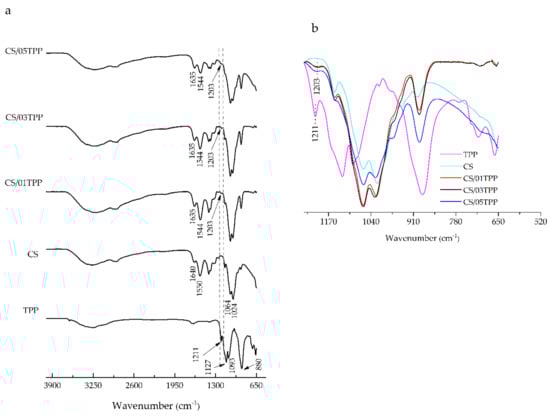 Fourier transform infrared (FTIR) spectra of sodium tripolyphosphate (TPP), non-crosslinked and ionically crosslinked chitosan membranes (a) from 4000–500 cm−1 and (b) from 1245–520 cm−1.