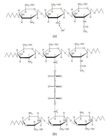 As reported by Mi, Sung, Shyu, Su and Peng [66], TPP dissolved in water dissociates into Na+ and tripolyphosphate ions , but ions undergo the process of hydrolysis. As a result, when the crosslinking process occurs in TPP solution of basic pH (pH = 9.1) only a slight number of chitosan amino groups is protonated (ionization degree is lower than 5%). In this solution, and ions are present and they can competitively react with groups of chitosan by deprotonation and ionic crosslinking, respectively, as presented in Figure 3.