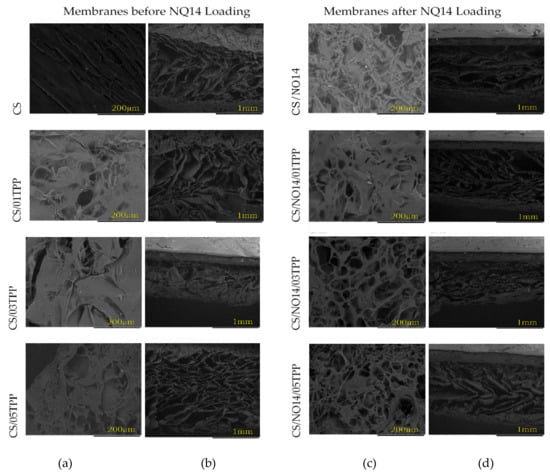 All membranes possess a three-dimensional interconnected macroporous structure. From the surface view (Figure 6a), the microstructures of non-crosslinked and crosslinked chitosan membranes are quite different. It can be noted that the crosslinked chitosan membranes surfaces were more porous, especially those loaded with NQ14. Open structures with more porosity obtained by crosslinked chitosan loaded with NQ14 could be attributed to higher chitosan chain mobility due to its lower crystallinity, according to previously shown WAXD data (Figure 4). From the cross-sectional view (Figure 1b), open pore microstructure with a high degree of interconnectivity was preserved in all membranes. However, the mean pore size decreased from the non-crosslinked to the crosslinked membranes. No big difference between the crosslinked membranes was observed, except for the one crosslinked with 0.3% of TPP (CS/03TPP and CS/NQ14/03TPP), where elongated pores existed together with condensed walls [77]. The explanation for this observation can be related with the fact that this amount of TPP (0.3 wt %) restrains the movement of the molecular chain of chitosan due the high crosslinking density preventing the reorganization of chitosan chains [78,79,80]. These results show that microstructure such as pore size and its distribution, porosity as well as pore shape is dependent on TPP concentration, and NQ14 presence can influence the controlled release of drugs since it can allow the penetration of biological fluids, facilitating the diffusion of the drugs to the medium.
