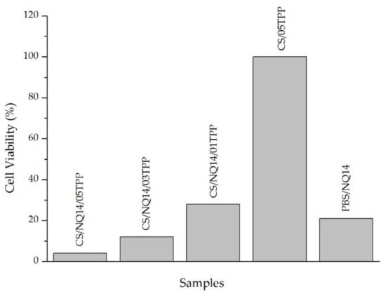 MTT assay was employed to investigate the anti-proliferative effects of 1,4-naphthoquinone (NQ14) incorporated into ionically crosslinked CS membranes. B16F10 melanoma cell line was used for this test. Our results (Figure 9) demonstrated that NQ14-loaded crosslinked CS membranes (CS/NQ14/05TPP, CS/NQ14/03TPP and CS/NQ14/01TPP) vigorously hampered the cell viability compared to NQ14-unloaded crosslinked CS membrane (CS/05TPP) used as control. This indicates that NQ14 is a potent inhibitor of melanoma cell growth and shows the efficacy of CS/TPP membranes in carrying the drug inside the cells. Although the three membranes (CS/NQ14/05TPP, CS/NQ14/03TPP and CS/NQ14/01TPP) have showed high cytotoxic activity, the viability of cells treated with NQ14 loaded in CS/05TPP and CS/03TPP membranes fell to less than 15%, indicating the greater efficacy of these membranes in carrying the drug inside the cells. These results suggest that these samples can be considered promising for cancer therapy. In addition, since anti-proliferative agents, such as clinically used anti-cancer agents, suppress angiogenesis by inhibiting endothelial cell proliferation [87], NQ14 would be a potent anti-angiogenic agent. Our results agree with those found by other authors [47,48,88,89].