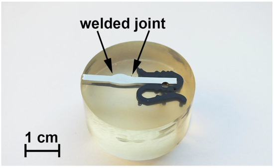 The cross-section of the investigated aluminium alloy with a welded joint area for SVET/SIET measurements (Figure 1) was prepared using a Tegran 25 device (Struers A/S, Denmark). The sample comprising a plate was imbedded into ViaFix acrylic resin at an angle of 90 degrees to the surface. After preliminary processing with sandpapers, the sample was ground with the MD-Largo disk using 9 μm diamond suspension and then polished with MD-Mol and MD-Nap disks using 3 and 1 μm diamond suspensions, respectively. After polishing, the sample was washed with deionized water and air-dried.