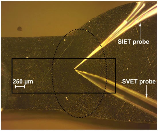 An external reference electrode was a silver-chloride Ag/AgCl/0.1 M KCl, 0.01 M KH2PO4 electrode. The microelectrodes were mounted on the SVET/SIET system. The SVET/SIET measurements were controlled by means of ASET 2.0 software (ScienceWares, Falmouth, MA, USA). A preamplifier with 1 PΩ input impedance was used to measure the potential. Quasi-simultaneous SVET/SIET measurements [44] were made on the aluminium alloy samples. The distance between the SVET and SIET probes was (50 µm) – (25 µm) – (−50 µm) in X-Y-Z coordinates, respectively. The SIET probe was positioned 50 μm ahead of the SVET probe to avoid breaking the glass microelectrode due to the probe vibration and to minimize the possible cross-talk effect and solution stirring by the SVET probe.
