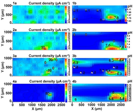 The (a) SVET and (b) SIET diagrams of the current density and pH distribution on the surface of the welded 1579 Al alloy sample after (1a,1b) 30, (2a,2b) 90, (3a,3b) 240, and (4a,4b) 510 min of exposure to 0.5 M NaCl. There is a migration of the anodic zone from the bottom part to the center (bulk of the material) of the investigated area during the exposure time.