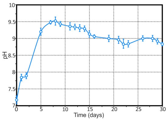 The evolution of bulk pH during 30 days of immersion experiments of the 1579 Al alloy in a 0.5 M NaCl solution. Intensive dissolution of the Mg as an alloying element of the 1579 Al alloy sufficiently shifts the bulk pH values to the alkaline range.