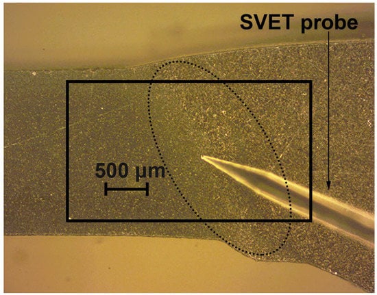 The probe for scanning vibrating electrode technique measurements was a Pt–Ir insulated wire with a Pt black deposited on a spherical tip of a diameter of 10 μm. The SVET probe was located at 100 μm ± 5 μm above the monitored surface and vibrated in the horizontal (X-axis) and vertical (Z-axis) planes relative to the studied surface. Frequencies of the probe vibration were 128 Hz (X-axis) and 325 Hz (Z-axis). Only the vertical (Z-axis) component was used for treating experimental data and calculating the total current [27,28,33]. The probe vibration amplitude was equal to 20 μm.