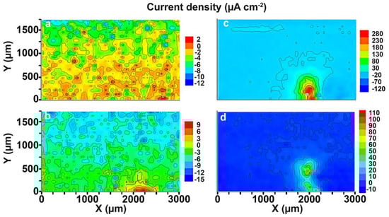 SVET diagrams of the current density values distribution on the surface of the welded joint area of the 1579 aluminium alloy sample after (a) 1.5, (b) 4.5, (c) 81, and (d) 87 h of immersion in 0.5 M NaCl. There is an anodic zone at the right bottom part of the investigated area.