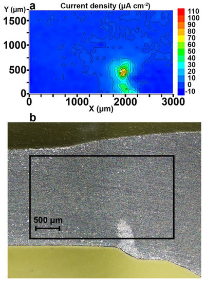 The (a) SVET data and (b) optical image of the mechanically treated sample after 87 h of immersion. The (b) presence of the defect in the bottom part of the welded joint area and (a) higher values of the current density in this zone revealed that the sample had undergone an intensive corrosion process.