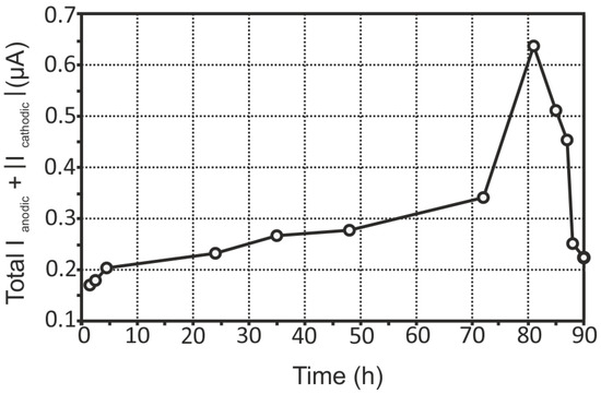 The evolution of the sum of total cathodic and anodic currents for the aluminium alloy sample with a welded joint is shown in Figure 11.