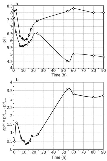 (a) pH max and (b) pH min as a function of time and ∆pH evolution with time for the 1579 Al alloy sample. This specimen varies very intensively, from 0.35 to 3.60, confirming the high corrosion activity of the welded 1579 aluminium alloy.