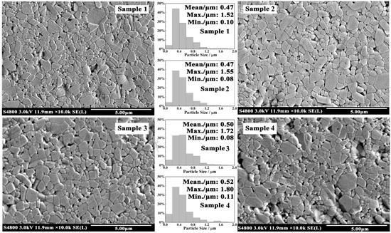 Four samples were cut and polished for FESEM testing. The microstructure of the cross section is shown in Figure 4. With the increase in Gd2O3 content, the grain size of the sample took on a trend of polarization: The size of small grains decreased and their quantity increased; however, the size of big grains increased and the average grain size increased.