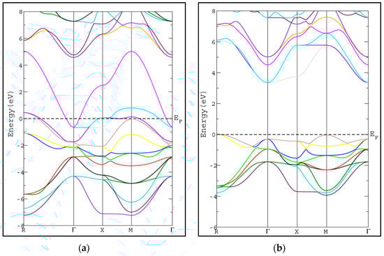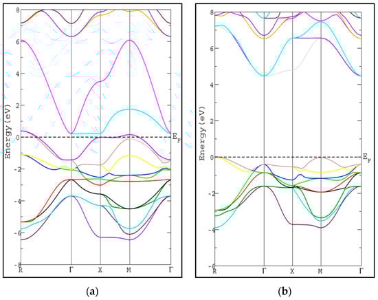 Band structure of cubic pervoskite using PBE-GGA method for (a) SrRhO3 and (b) SrZrO3 compounds.