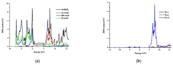 The total and partial density of states for SrRhO3 and SrZrO3 are shown in Figure 5 and Figure 6 for an energy range from −15 to 14 eV and −12.5 to 14 eV, respectively. In SrRhO3, the valence band originates from O-p and Rh-d states. The maximum contribution of the Rh-d state is near the Fermi level. In the conduction band, the bands are due to the Sr-d with a small contribution from Rh-d, O-p and O-s states. In SrZrO3, the valence band originates from O-p with few contribution from Zr-d,p and Sr-d states. In the conduction band, the bands are due to Zr-d and Sr-d states with a small contribution from O-p states.