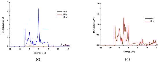 (a) Total density of states of SrRhO3 compound and partial density of states for (b) Sr atom, (c) Rh atom and (d) O atom in SrRhO3 compound.