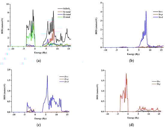 (a) Total density of states of SrZrO3; Partial density of state for (b) Sr atom, (c) Zr atom and (d) O atom in SrZrO3 compound.