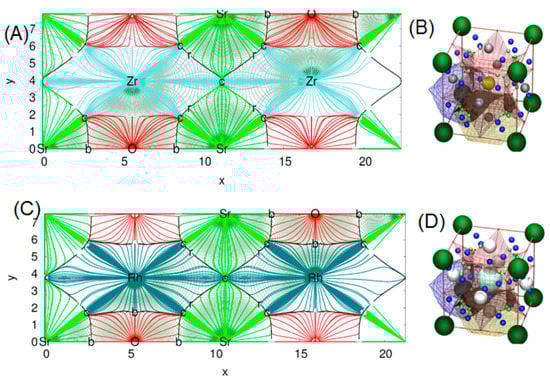 This program uses the quantum theory of atom in molecule (QTAIM) to make a topological analysis of the electronic density (ρ) of a crystal. By means of QTAIM, we can automatically locate all critical points (CP’s) of the electronic density rising from a nil flux of the electron density gradient condition []. The procedure implemented in critic is to divide ρ into disjoint regions Ω (basins) through the real space approaches. Here, we can generate topological schemes in two or tridimensional plots. It is clearly shown from the topological distribution of the charge density in Figure 7A, that the charge distribution in the SrZrO3 compound is spherically symmetrical. This suggests that all electronic charges are localized around anions—a typical ionic bonding. The same trend is also displayed for the second compound with some small difference in the distribution of ρ due to the charge transfer, which differs in the two titled compounds (see Figure 7C). We also present in Figure 7B,D, the molecular graph of our two perovskites.