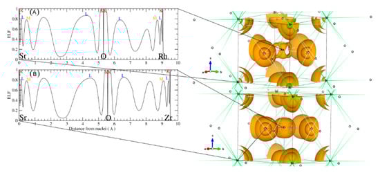 These plots were done following the character of Wyckoff’s, bond CP and ring CP family []. The form of the atomic basin generated by the CCP point suggests that both SrRhO3 and SrZrO3 are belonging to the R11 family (see Figure 7B,D) []. Here, we can define a topological charge of each atomic basin. As results, Q(Sr) = 1.59 electron, Q(Rh) = 1.47 electron and Q(O) = −1.05 electron for SrRhO3, and Q(Sr) = 1.61 electron, Q(Zr) = 2.49 electron and Q(O) = −1.37 electron for the SrZrO3 compound. When we compare these charges with the oxidation number corresponding to each of the atoms, we find that the charge transfer is mainly due to the strontium one, with an equal percentage of 80% in both perovskites. However, we note that replacing the cation Rh with electro-negativity of 2.2 by the Zr one with low electro-negativity of 1.4 has a negligible effect on the nature of the bonding. The SrZrO3 has a more ionic trend. However, even the constituent cations show different charge transfer (Zr and Rh are transferred by 62% and 37%) and each of them varies as strongly as the oxide ions. The latter adapt their charges according to electro-neutrality requirements. There is a second topological index that has been proposed as a global measurement of the degree of metallicity, the electron density flatness defined as  where  is the minimal electron density found on the unit cell (it necessarily corresponds to a critical point) and  is the maximal electron density among bond critical points. This flatness has values close to one on common metallic compounds and close to zero on localized bonding compounds []. The delocalization of electrons (flatness) in the SrRhO3 and SrZrO3 compounds are respectively equal to 80.61% and 5.62%. This suggests that the global chemical behavior of SrRhO3 is metallic, whereas SrZrO3 is nonmetallic. To go further in the characterization of the bonds nature of the titled compounds we have employed another tool named the electron localization function (ELF) [], which is based on a measure of the likelihood of finding an electron in the neighborhood space of a reference electron located at a given point and with the same spin. Taking into account that the homogeneous electron gas has an ELF value of 0.5, valence electrons of metals should deviate very slightly from this quantity. The ELF isosurfaces, as well as the one-dimensional projections of Sr–O–Rh and Sr–O–Zr bond paths of the investigated perovskites are depicted in Figure 8. It is strikingly clear from the plot that O–Zr and O–Rh are different. The integration of population on the ELF attractor of the SrZrO3 compound shows two types of Zr–O bonds, the first one has ELF maxima equal to 0.78 and the second to 0.83; the former has the negligible population, but the latter has 0.95 electrons. The integration gives a number of the delocalized attractor as lone pair bonds around the Sr and Zr cations; the population in this attractor varies from 1.4 to 1.1 electrons. Regarding the second compound (SrRhO3), no O–Rh bonds have been found, only delocalized lone pair ones with ELF maxima near to 0.5 are reported. Here, we should emphasize that the delocalization of these attractors in the SrRhO3 compound provides a reliable measure of the delocalization of wave function and its localization in the SrZrO3 compound.
