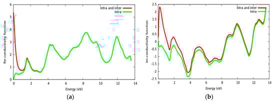 The conductivity function of SrRhO3 compound: (a) Real part; (b) Imaginary part.