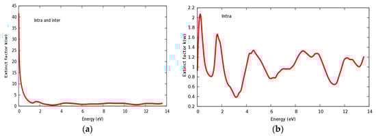 (a) Extinct factor k(ω) within inter and intra; (b) Extinct factor k(ω) within intra for SrRhO3 compound.