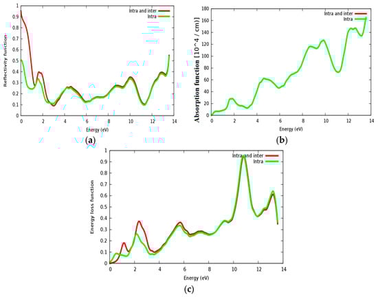 The reflectivity spectra of SrRhO3 as a function of energy are shown in Figure 13a. The static reflectivity of SrRhO3 within intra and inter transition is 0.95, while it is 0.5 within intra transition. The reflectivity of SrRhO3 in the low energy region goes down as the incident light energy increases, while it increases in the high energy region—the far ultraviolet region (FUV). The absorption coefficient spectra of SrRhO3 is plotted in Figure 13b, absorption spectra, as shown, begins at the early beginning and increases as the incident photon energy increases with some peaks along the spectrum. The observed peaks in the spectra related to electron transitions from conduction to valence bands, sharp peaks in the absorption spectrum may be accordance with transitions between valance and conduction band (inter band transitions) that can be considerably far from each other. The SrRhO3 compound is a good absorbent compound because it is a metal compound and it is identical with intra + inter and intra band transition. Peaks in the spectrum of the absorption coefficient are proportional to the peaks in the (ε2) spectrum. The energy loss function L(ω) is describing the energy loss of the fast electrons that propagate inside the material. The energy loss spectrum of SrRhO3 is depicted in Figure 13c. Energy loss for SrRhO3 is high along the whole spectrum and it is identical with intra + inter and intra band transition in the high energy region. We observe some peaks, the highest peaks are related to the plasma frequency []. From these Figures, the plasma frequency of SrRhO3 occurs at 10.9 eV and 13.2 eV.
