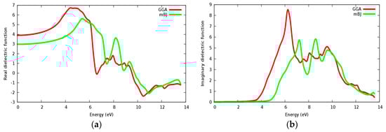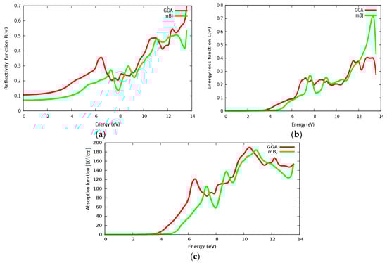 Figure 14a,b displays the calculated real and imaginary parts of the dielectric function for the SrZrO3 compound for a radiation up to 14 eV. It is seen that the calculated linear optical components ε1(ω) and ε2(ω) spectra for SrZrO3 are different from SrRhO3. The calculated ε2(ω) spectra show that the first critical point (threshold energy) of the dielectric function occurs at about 4.52 eV within the mBJ approach (GGA: 3.6 eV) for SrZrO3; the first critical points are comparable with the energy band gap computed from the energy band structure. We can see from Figure 14b, that ε2(ω) displaced to the high energy region within the mBJ approach, but the first peak in ε2(ω) within the GGA approach has a higher value. The threshold’s energy is followed by some peaks that originate from direct optical transition between the valence band and conduction bands. The main peak in the absorptive spectra is positioned at about 7.2 eV within mBJ (GGA: 6.2 eV). The real part ε1(ω) gives us information about the material’s polarizability; the static dielectric constant ε1(0) of SrZrO3 is 3 within the mBJ approach (GGA: 3.92), as we can see that the mBJ approach has a lower value of ε1(0). The value of ε1(ω) within mBJ displaced to the higher energy region along the spectrum. The behavior with the high dielectric constant makes SrZrO3 a possible useful candidate for manufacturing high capacitors []. The negative value in the spectra of ε1(ω) for the SrZrO3 compound is located only in the ultraviolet spectrum; and shows the metallic behavior of this compound in the mentioned region.