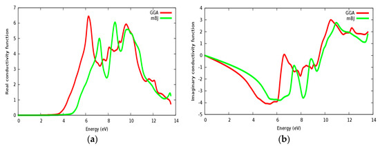 In Figure 15a,b, the real and imaginary parts of conductivity are illustrated for SrZrO3, respectively. It can be seen from Figure 15a, that the real part of conductivity starts to have considerable values at about 4.75 eV within the mBJ approach (GGA: 3.6 eV). From the conductivity and imaginary part of the dielectric function spectrums (Figure 14b), it is shown that both of them start to have a considerable value from approximately the same value. We have also observed some peaks in the conductivity spectra as also observed in the ε2(ω) spectra. The conductivity increases as the material becomes more photon (energy) absorbent.