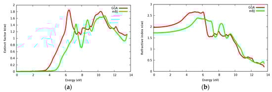 (a) Extinct factor k(ω); (b) Refractive index n(ω) for SrZrO3 compound using both PBE-GGA and mBJ-GGA methods.