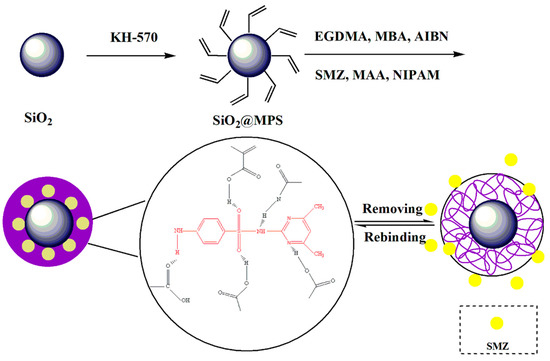 The process of synthesizing thermosensitive molecularly-imprinted polymers is shown in Figure 1. First, SiO2 was synthesized by the sol-gel method. Then, the vinyl was grafted on the surface of the SiO2 by reacting with MPS. Finally, the SiO2@MPS reacted with MAA, which made the nanoparticles easier to cover with polymer layers. In this paper, two cross-linking agents were selected, in which the amount of EGDMA could lead the polymer to form a certain rigid structure, so as to improve the reusability of MIPs. Meanwhile, MBA could optimize the hydrophilicity of the polymer [26,27] so that MIPs can be applied to the adsorption of SAs in a water environment, which expands the practical applications.