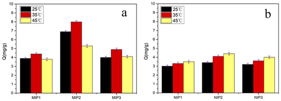 Adsorption capacities of three groups of MIPs (a) and non-imprinted polymers (NIPs) (b) at different temperatures (10 mg of MIPs/NIPs in 5 mL of 0.3 mmol·L−1 sulfamethazine (SMZ) solution for 5 h). Each Q value takes the average of three measurements, and the error bars represent the SD.