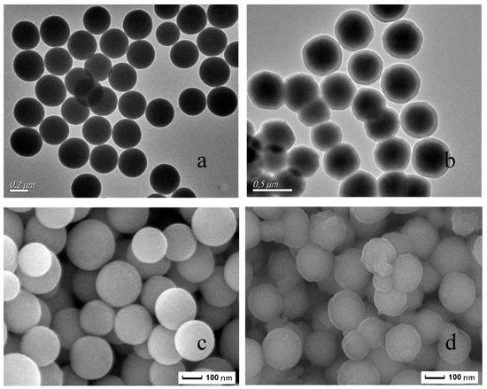 The transmission electron microscope (TEM) images of SiO2 (a), MIPs (b) and the scanning electron microscope (SEM) images of SiO2 (c), MIPs (d).