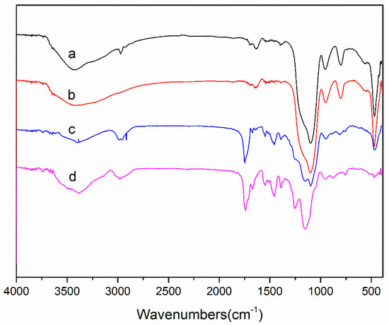 Figure 5 compares the FT-IR spectra of the SiO2, SiO2@MPS, MIPs, NIPs. In Figure 5a, the peak of 1099.2 cm−1 conformed with the Si–O–Si asymmetric stretching vibration, and the peaks above and under 468.4 cm−1 and 801.6 cm−1 could be attributed to the Si–O bending vibration and symmetrical stretching vibration, respectively. These strong peaks were typical SiO2 characteristic peaks. In comparison, Figure 5b shows the C=C absorption peak of the infrared spectrum of SiO2@MPS at 1646.6 cm−1, which indicated that the SiO2 was modified by KH-570. Figure 5c,d were approximately similar in shape, except for the peaks in Figure 5a,b, as well as the C=O vibrations of EGDMA at 1732.9 cm−1 and 1387.7 cm−1 peak and the C–H stretching peak. The amide I and amide II bands of NIPAM were observed at peaks 1637.7 cm−1 and 1545 cm−1, respectively, and 1456.2 cm−1 was marked as the –COO– stretching peak for MAA. The presence of these peaks indicated that the functional groups were present in each step of the synthesis. At the same time, a juxtaposition of Figure 5c,d informs the ability of the above characteristic peaks to prove that the imprinted layers were encapsulated on the surface of the spheres, and that the non-imprinted materials were also successfully prepared.