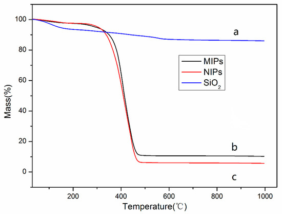 The thermogravimetric analysis (TGA) curves of SiO2 (a), MIPs (b), NIPs (c).