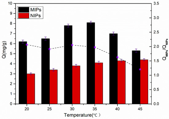 As shown in Figure 7, the adsorption amount of the template molecules (SMZ) on the MIPs and NIPs varies along with the temperature. Notably, the adsorption capacities of SMZ on MIPs first increased, before they decreased within the temperature range from 20 °C to 45 °C. The phenomenon depended on the volume change of molecular imprinted cavities, and the change was related to the existence of the temperature sensitive monomer NIPAM [29]. The Q value of the MIPs reached the maximum at 35 °C, because the shape and size of the imprinting pits were basically consistent with the template molecules. When the temperature was under 35 °C, the polymers were hydrophilic, and the imprinted cavities dilated. When the temperature was higher than 35 °C, the hydrogen bonding force was destroyed to a certain degree. As a result, the hydrophilicity of the polymer was weakened, and the imprinting cavities were too tight, which caused a decrease in the adsorption capacities with increasing temperature. However, the SMZ adsorption capacities of the NIPs varied as the temperature changed, with a different pattern from that of the MIPs. As the temperature increased, the adsorption capacities of the NIPs also slowly increased, because the increased hydrophobicity led to an increase in nonspecific adsorption. As shown, a variation in temperature can affect the spatial structure of the imprinted polymers, as well as the hydrophilicity and hydrophobicity, and can eventually impact the adsorption capacities of the MIPs of the target. Therefore, the next adsorption experiments were designed to be carried out at 35 °C.