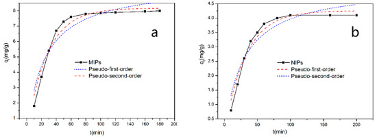 Adsorption kinetics fitting curves of MIPs (a) and NIPs (b) at 35 °C (10 mg of MIPs/NIPs in 5 mL of 0.3 mmol·L−1 SMZ solution).