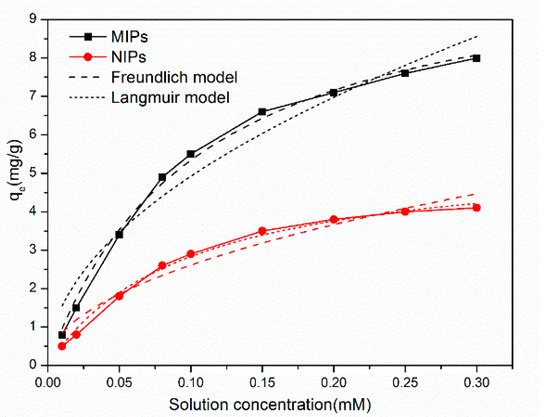Adsorption isothermal fitting curves of MIPs and NIPs at 35 °C (10 mg of MIPs /NIPs in 5 mL SMZ solution with a concentration range of 0.02 to 0.3 mmol·L−1 for 5 h).