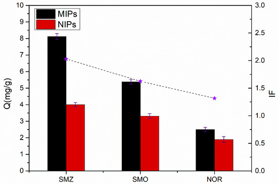 Figure 10 shows the adsorption capacities of the MIPs and NIPs for SMZ, its structural analogue SMO, and the structurally dissimilar materials NOR. As shown in Figure 10, the adsorption capacities of MIPs to SMO, as well as those of the NOR, were lower than SMZ, indicating that the MIPs had nearly no selective adsorption to SMO and NOR, whereas the target molecule SMZ had a comparatively higher affinity for the imprinted polymers. The result indicates that the conformational memory effect of the imprinting cavities was an important factor the imprinting efficiency. MIPs slightly adsorbed SMO, owing to the fact that the molecular structure of SMO also contained –S(=O)2− groups. The adsorption capacity of MIPs to NOR was low due to the fact that the molecular structure and size of NOR were far from the imprinting cavities and thus did not easily form functional forces with functional monomers. However, the binding amounts of NIPs to these three substances were similar. This is likely a result of the fact that NIPs had no imprinting sites on the surface, and that their adsorption forces on SMZ, SMO and NOR were nonspecific and physical in nature.