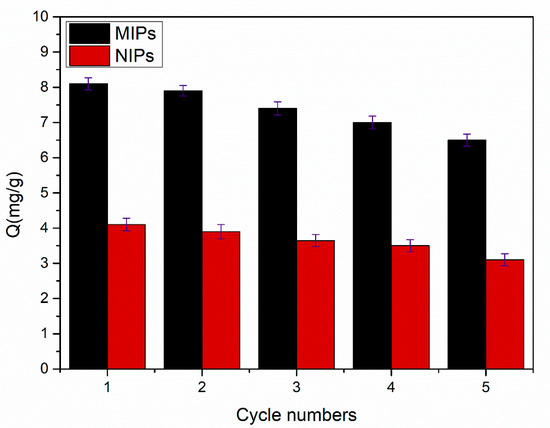 The recycling of MIPs and NIPs (10 mg of MIPs / NIPs in 5 mL of 0.3 mmol·L−1 SMZ solution for 5 h). Each Q value takes the average of three measurements, and the error bars represent the SD.