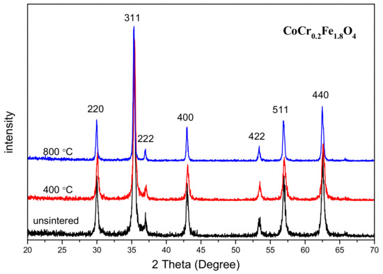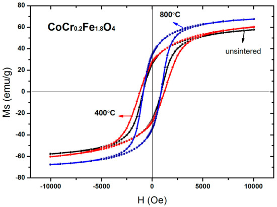 The room temperature magnetic hysteresis loops for un-sintered CoCr0.2Fe1.8O4 and for the same material after annealing at 400 °C and 800 °C are displayed in Figure 9. The data summarized in Table 6 indicate that saturation magnetization of the CoCr0.2Fe1.8O4 increased with annealing temperature, which was attributed to the increase in particle size [13]. During the annealing process, the net reduction of the free energy of the solid-solid interface and the free energy of the solid-vapor interface is the driving force for grain growth [13,28]. The coercivity of the CoCr0.2Fe1.8O4 initially increased and then decreased as the annealing temperature was increased. This can be explained by the associated variation in grain size [29,30]. In the range of single domain sizes, the coercive force can be expressed as HC = g − h/D2. In the range of multi-domain sizes, the coercive force can be written as HC = a + b/D as the particle size changes. “g, h, a, b” in the formula are constants, and “D” is the diameter of the particles [21,31]. Therefore, as the particle size becomes larger in the single domain range, the coercive force becomes larger; and in the multidomain range, as the particle size increases, the coercive force decreases [32,33]. In the present study, the grain size of CoCr0.2Fe1.8O4 calcined at different temperatures may lie in the single domain region or the multi-domain region, so coercivity increases initially and then decreases as the annealing temperature is increased [34].