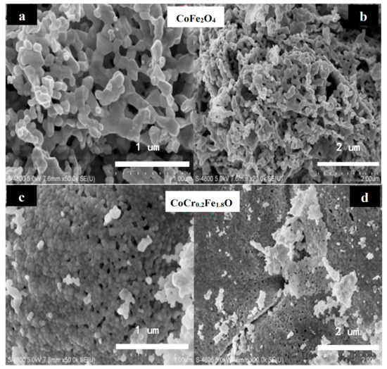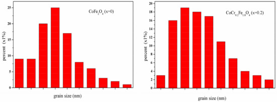 The SEM micrographs of CoCrxFe2−xO4 (x = 0, 0.2) ferrites annealed at 800 °C for 3 h are shown in Figure 3. It can be observed that the grain size is almost uniform and the material is well crystallized for CoCrxFe2−xO4 (x = 0, 0.2). Histograms of the comparative grain size distributions of CoFe2O4 (x = 0) and CoCrxFe2−xO4 (x = 0, 0.2) ferrites are shown in Figure 4. The average particle sizes of CoFe2O4 and CoCrxFe2−xO4 were estimated by a statistical average method to be approximately 96.26 and 51.76 nm, respectively. This shows that the prepared ferrite powders were nanoparticles and that the average grain size decreased significantly by increasing the Cr content, which can be due to the ionic radius of iron atoms being larger than the ionic radius of chromium atoms. The average crystallite size was determined by XRD to be slightly smaller than the average grain size [15].