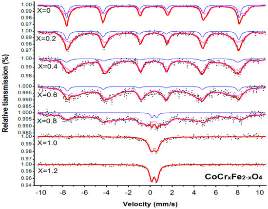 The room temperature Mössbauer spectra for CoCrxFe2−xO4 are shown in Figure 5. The data of all samples were analyzed using Mösswinn 3.0 software. When 0 ≤ x ≤ 0.6, the spectrum of the sample CoCrxFe2−xO4 is fitted with two sets of six-line peaks, because Fe3+ takes the tetrahedral A at the B-position of the octahedron. This indicates the ferromagnetic properties of the sample. Among them, the six-line peak of the B position is larger in the isomer shift (I.S.), and the six-line peak of the A position is smaller. This is because the bond length of the tetrahedral A site Fe3+_O2− is smaller than the bond length of the octahedral B site Fe3+_O2−, and the orbital overlap of the A site Fe3+_O2− is larger; that is, the A site is more covalent than the B site. The covalentity is large, so the isomer shift (I.S.) of the B position is larger [6]. Other studies have shown that the isomer shift (I.S.) value of Fe3+ ions is 0.1 to 0.5 mm/s, while for Fe2+, it is 0.6 to 1.7 mm/s [16]. From Table 3, values for I.S. in the present study indicate that iron is in the Fe3+ state.